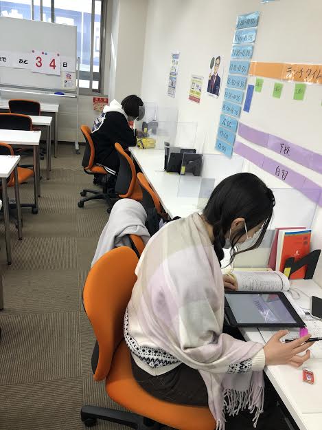 密集を避けるために、立川キャンパスで参加する生徒もタブレットを使って参加をお願いしています。