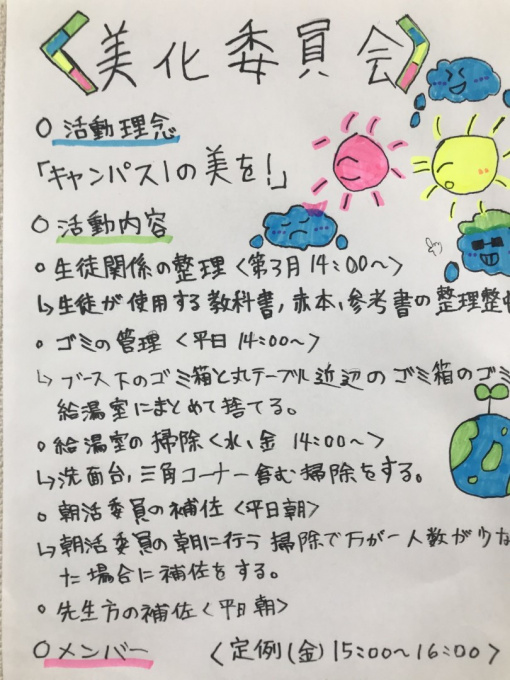 また、これをきっかけに生徒同士の繋がりを持って仲良くなってもらう為に様々な委員会があります。