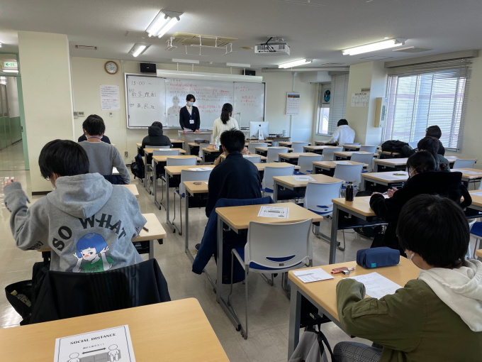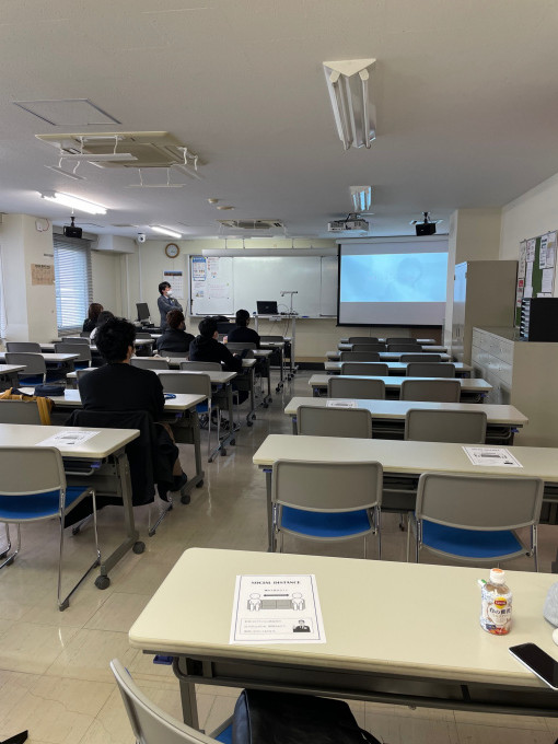 受付で「検温」「アルコール消毒」を実施してから教室に移動してもらいます。また、教室の座席も余裕をもって座っていただけるように広い教室を用意しています。