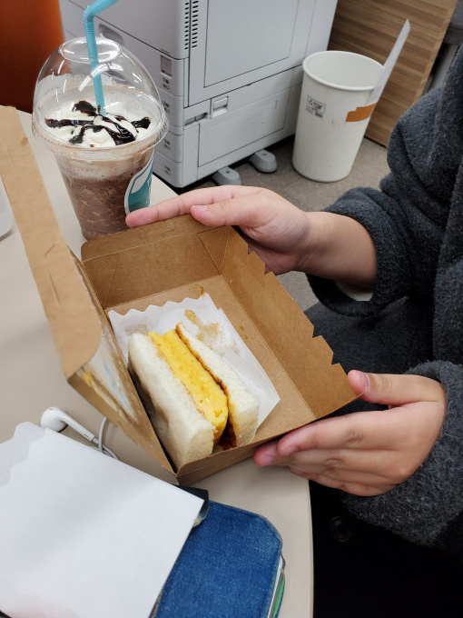 カフェのテイクアウトでサンドイッチを買ってきたようです。