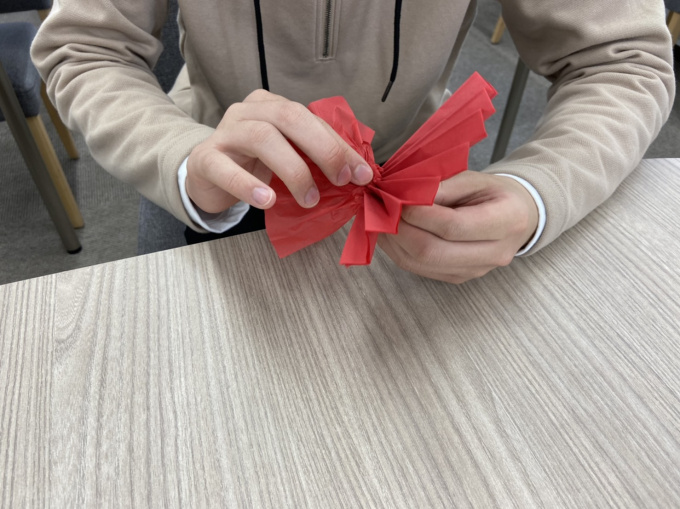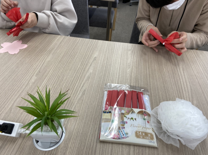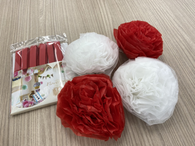 花紙を折って綺麗な紅白のお花を作っていますね 😛
