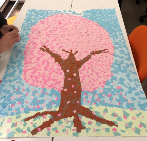この桜の木は、在校生の生徒たちが卒業生への感謝と労いの気持ちを込めて、1枚1枚紙をちぎって貼り付けて作成しました。