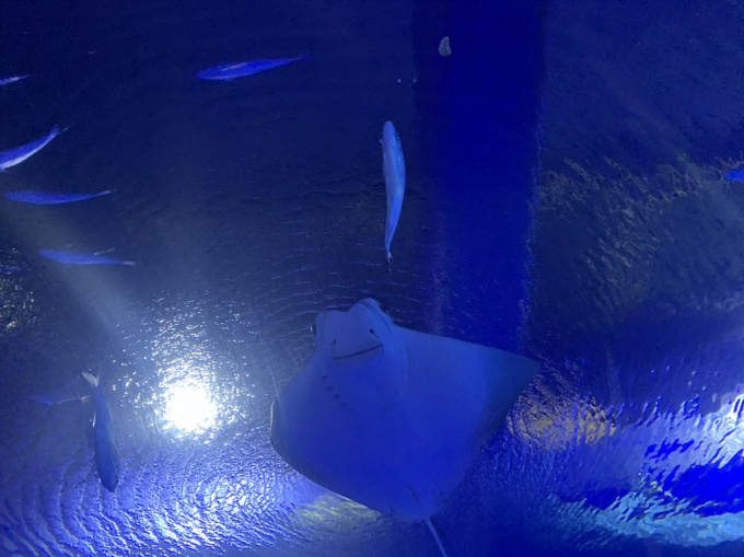 二匹もいる大きなジンベイザメ、大きなマンタ、大水槽。