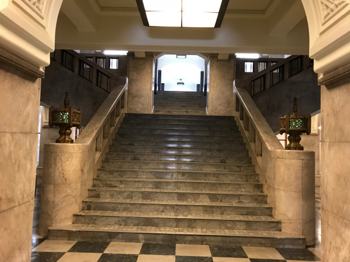 ・2階の議場へつながる連絡廊下でドラマや映画の撮影にもよく使われている中央階段