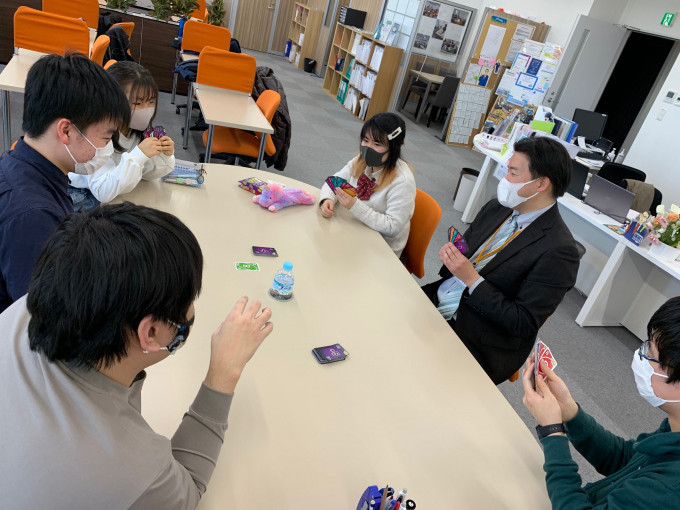 金山キャンパスでは、高等部の生徒が中等部の生徒と一緒に勉強をしていたり、カードゲームをしたりと学年に関係なく一緒に過ごしています。