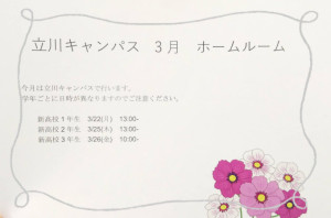 新高校2年生、3年生のホームルームを改めてお知らせします。該当の日時に立川キャンパスにお越しください。