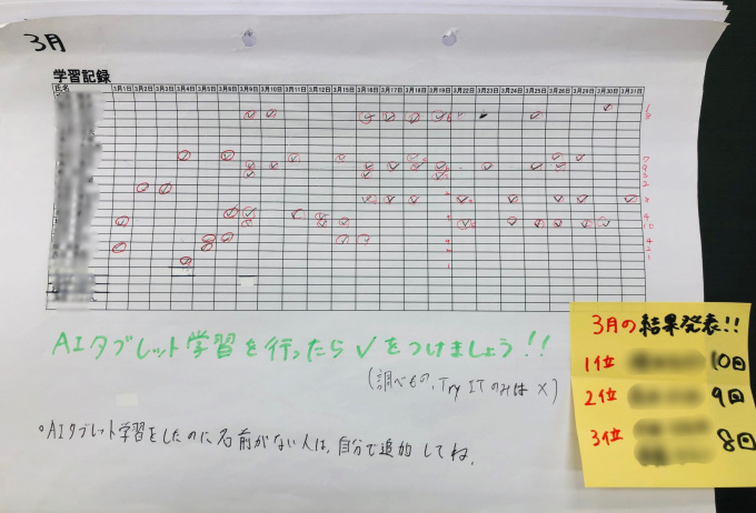 下の画像は生徒がAIタブレット学習の進捗状況を記録する表です