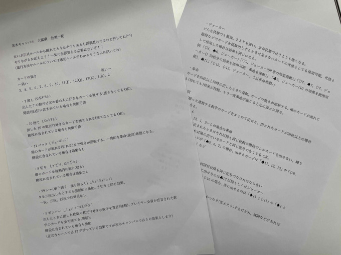 「大富豪」は茨木キャンパス独自のローカルルールが多く、新入生などが参加しにくいことを改善したいなと考えていたところ、なんとTくん(高3生)がルールの一覧を作成してくれました(≧∇≦)ノ