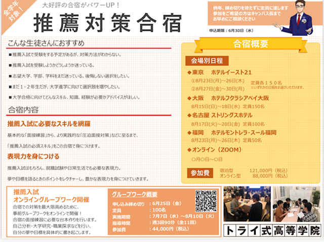 面接練習に入る土台作り、志望動機書・自己PRの作成など推薦入試で必要な準備を短期で行いますので、推薦入試を受験予定の生徒さんは検討してください!
