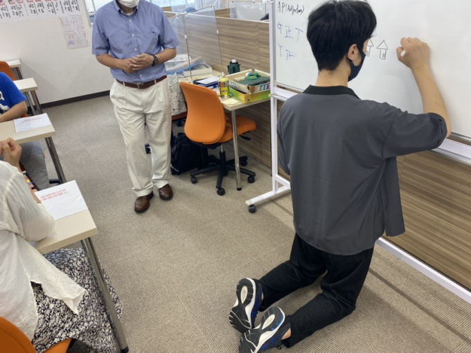 これは、お題に出された英単語を絵に描き、他の生徒が当てるゲームをしていた風景です。
