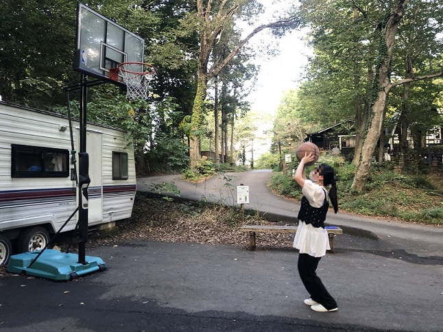 キャンプ場を回っているとバスケットボールのゴールがあったので、みんなでフリースロー対決をしました。