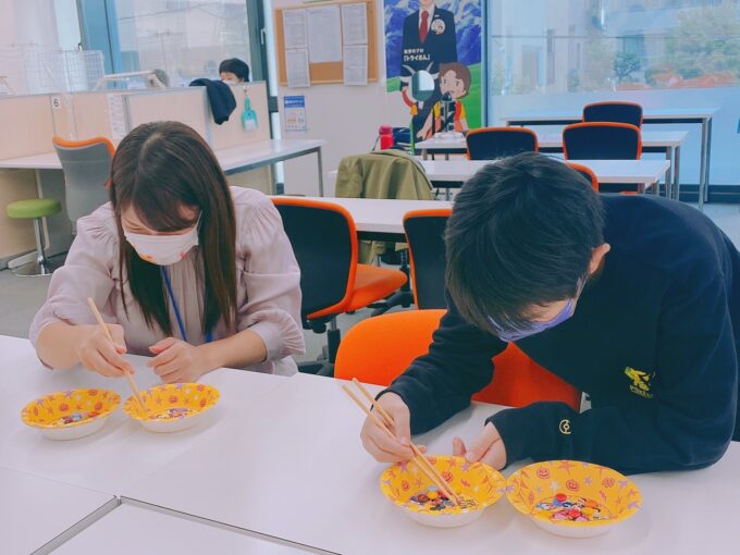 マスクで仮装した後は、お箸でチョコ掴み!☆