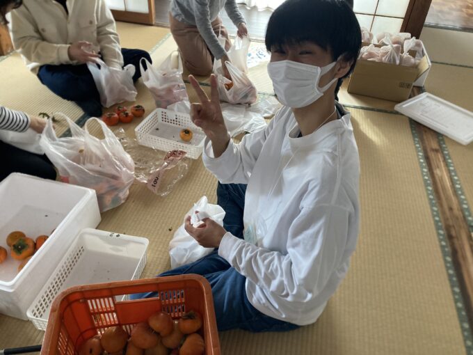 まずはじめに無料で配布する柿を4つずつ袋に入れる作業や