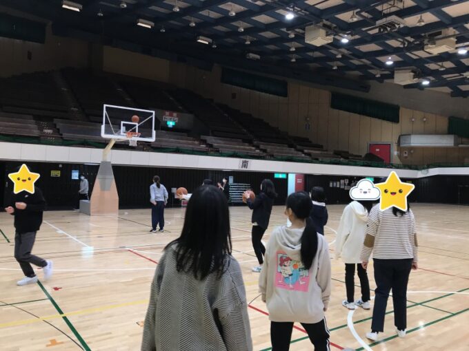 順番にバスケットゴールにボールを投げていき何回入ったかを競います。