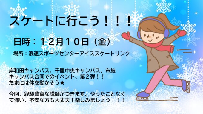 持ち物:参加費1200円(貸靴料金含む)、飲み物、手袋(5本指、指隠れるもの)