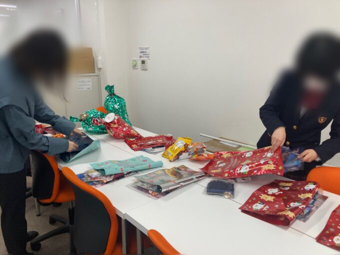 クリスマス会で配るプレゼントのラッピングをしました☆