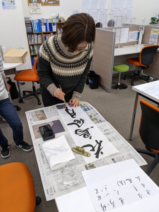 前回に引き続き今回の書道イベントも、年明けに書初め展へ出品する書初めを行いました。