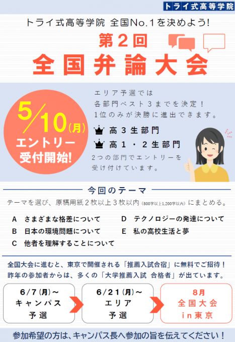 こんにちは! 京都のトライ式高等学院丸太町キャンパスです! 今回は第2回全国弁論大会についてご案内いたします・・・