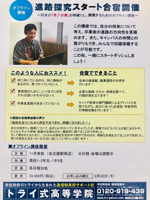 皆さんこんにちは! 通信制高校 サポート校 トライ式高等学院 千種キャンパスです! □ ~将来の「夢」「目標」を明確にし・・・