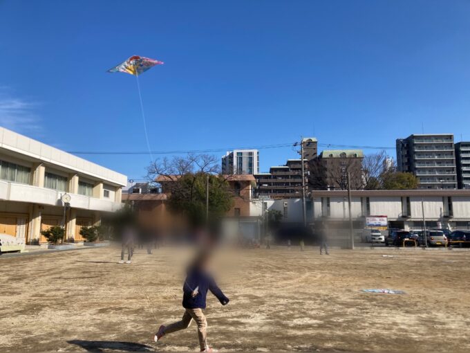 そして、風が弱かったので一生懸命走って、子供たちと一緒に凧揚げをしました♪