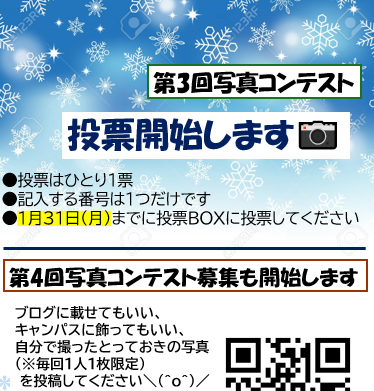 三宮キャンパスでは、先週から第3回写真コンテストの投票が始まっています(*^-^*)