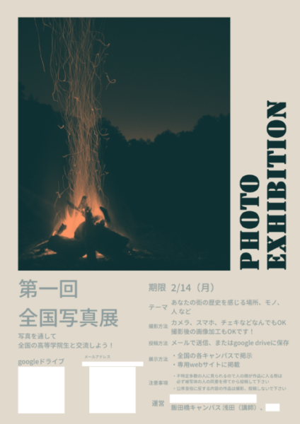 本日は、「第一回全国写真展」と、その応募作品をより多く集めるための前イベント「キャンパス周辺を散策して写真撮影会をしよう!」のお知らせです。
