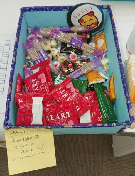 生徒が作ってくれた手作りの箱に、毎日お菓子を補充しています(^^)/