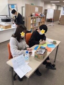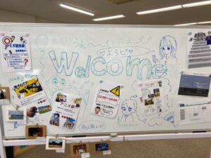 そのうち他の生徒も次々と登校し、名札立てを作成したり、レイアウトを考えながらホワイトボードに資料を貼ったり絵や文字を書き込んだり…