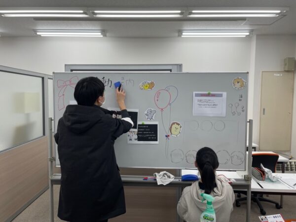 2月末の3送会や新しく立ち上がった活動をみんなに告知すべく、ホワイトボードの見栄えを良くしてくれています。