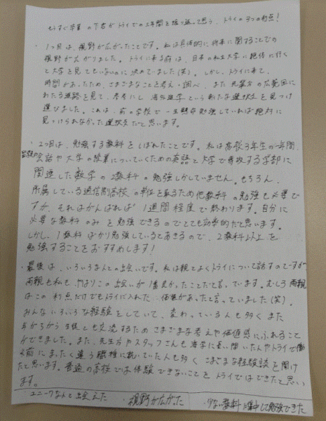 *3つ目は、色々な人との出会いです。私は親とよくトライについて話すのですが、両親も私も、やはりこの出会いが1番良かったことだと言っています。寧ろ両親は、この利点だけでもトライに入った価値があったと言っていました(笑)