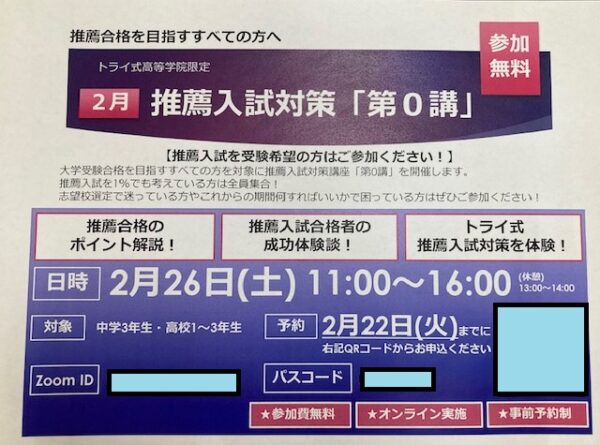 講座の詳細内容としては、推薦合格のポイント解説、推薦入試合格者の成功体験談、トライ式の推薦入試対策を体験できます!