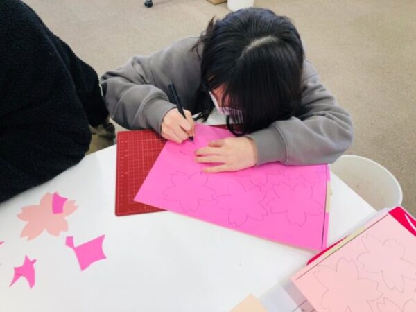 たくさん桜の花が書かれているピンクの画用紙を切っていきます。