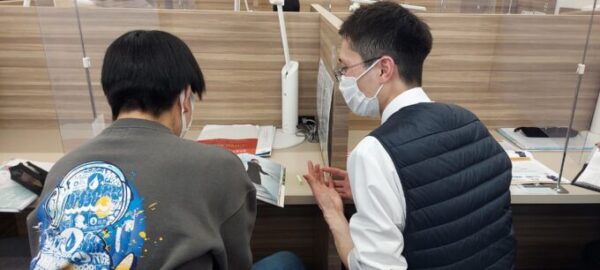 キャンパス長と進路について大学のパンフレットを見ながら相談しているSくん