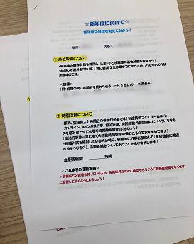 先日開催したホームルームで、今年度の振り返りと新年度の目標設定のためのワークシートを配布しました(^-^)