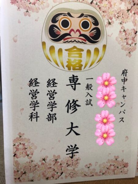 今回の合格を自信に、楽しい大学生活を送ってもらいたいと思います!