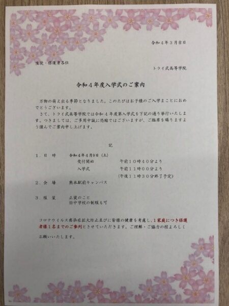 ①入学式 午前 11時00分~11時30分終了予定
