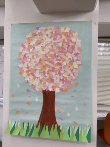 本日はスタッフとIくんで桜の木をちぎり絵で作成しました!!!