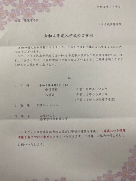 本日は【トライ式高等学院 千種キャンパス】の入学式のご案内をさせて頂きます。