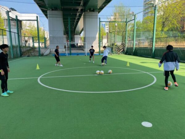 準備運動から始まり、二人一組でのパス回し、4対2でのパス回し等基礎的な練習からちょっとした実践練習も行っています。