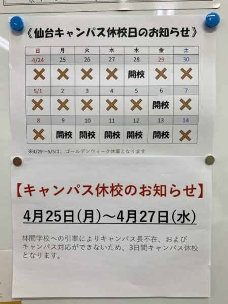 ※仙台キャンパスの電話も終日繋がらなくなるのでお気を付けください