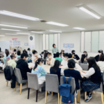 北西向きの池袋キャンパスの窓辺で、段ボールの家(箱)の中で育てられている豆苗たちです。