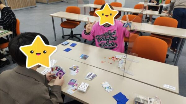 ↑HRとは関係ありませんが、ポケカで遊ぶ生徒の様子です。対戦相手募集中との事↑