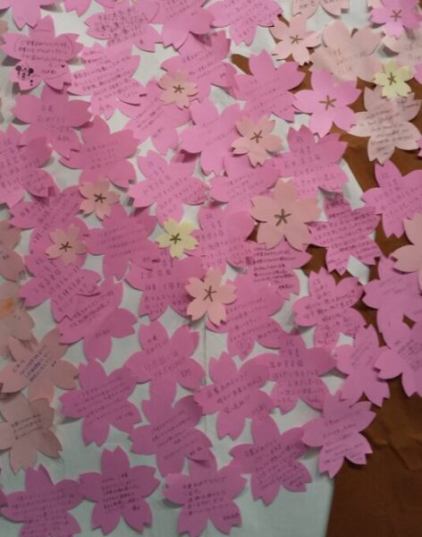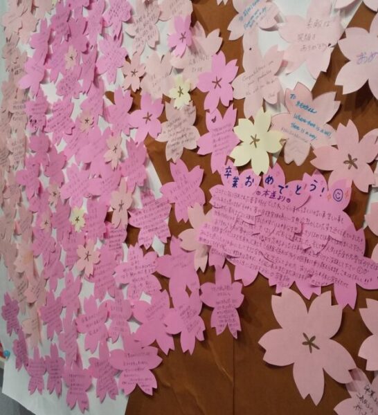 サクラの花ひとつひとつに、先生や在校生、スタッフからの卒業生へのメッセージが書かれています。