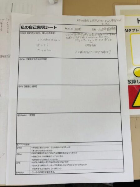写真のような自己実現シートを書いていき、自分のことを分析、考えつつ、