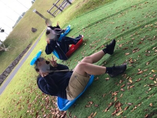 こちらは楽しそうに草スキーをする小禄キャンパスの生徒さんの様子です(^^)☆