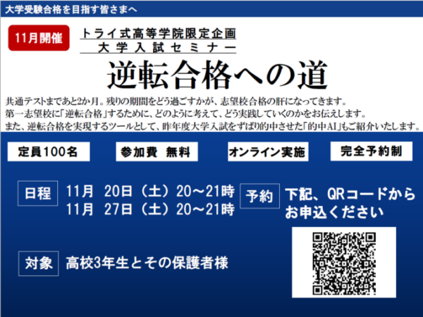 高校3年生対象の「大学受験セミナー/難関大ホームルーム第0講」のお知らせです♬