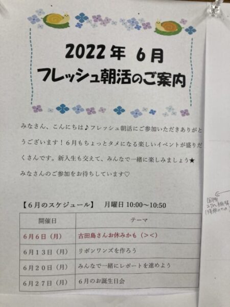 来月のフレッシュ朝活も、月曜日の10時から元気に楽しみましょう。