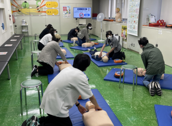 呼吸有無の確認方法、他者の助けを得ることの重要性の確認、胸骨の上を押して心臓マッサージをする方法、AEDの使用方法を人形を使って練習しました。