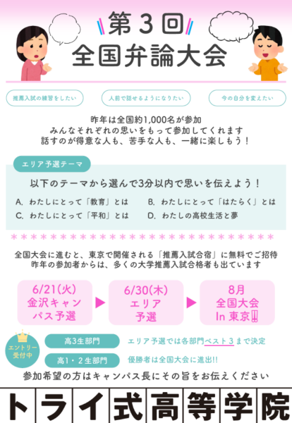 参加:トライ式高等学院金沢キャンパス高校1年生、2年生、3年生全員参加可能!