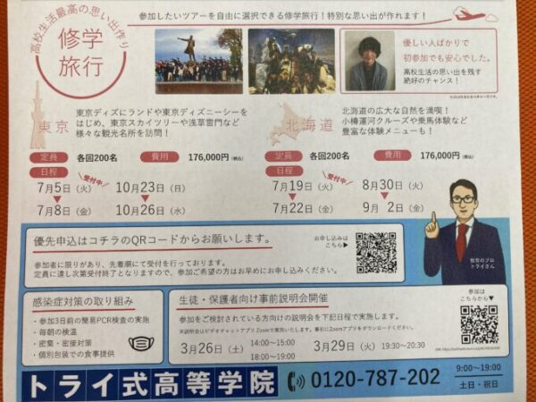 毎年大人気の修学旅行。トライ式高等学院では2つのプランをご用意★希望を選べます★